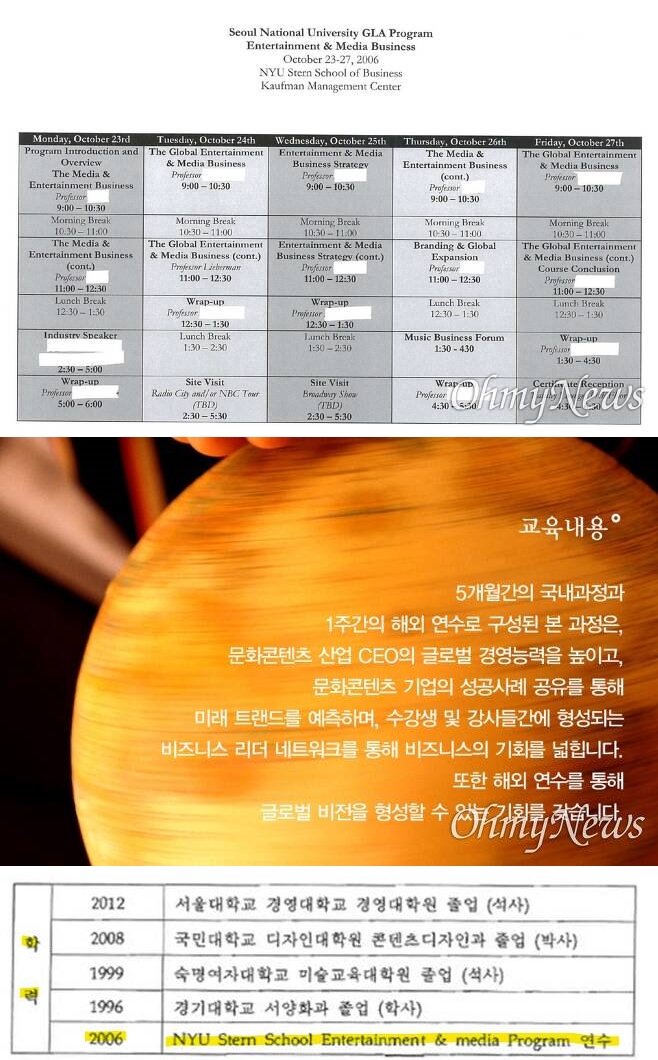 이어 소책자는 서울대 GLA 교육내용에 대해 "5개월간의 국내과정과 1주간의 해외 연수로 구성됐다"고 명시했다. 김씨가 주장한 '2006 뉴욕대 연수'가 뉴욕대가 아닌 서울대에서 개설한 GLA 교육과정 중 일부분이라는 것이다.