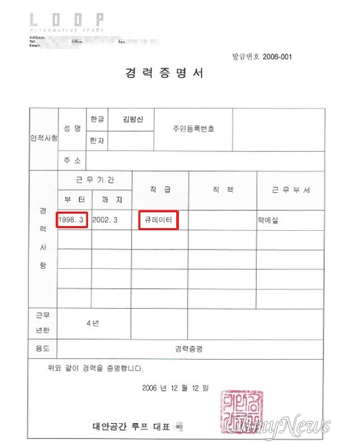 https://news.v.daum.net/v/20211223072101775 1. 2006년 김건희씨가 수원여대에 낸 루프 근무 경력증명서. 2. 김건희씨가 2006년 12월 수원여대에 낸 지원서. 수원여대 이력서엔 '98년 3월부터' 루프 큐레이터.. 해당 미술관 설립은 99년 2월 김씨는 지난 2006년 12월 겸임교원 지원을 위해 수원여대에 낸 지원서의 '경력사항'에 '산업체경력' 중 하나로 1998~2002년 대안공간 루프(국가지원사업) 학예실에서 큐레이터로 근무했다고 적었다. 김씨는 근무기간이 1998년 3월부터 2002년 3월까지 4년이라고 적시된 대안공간 루프(이하 루프)의 경력증명서(발급번호 2006-001)도 함께 냈다. 하지만 <오마이뉴스>가 루프 사무실을 직접 방문해 확인한 결과 루프의 설립 연도는 1999년 2월 6일이다. 김씨가 큐레이터로 근무했다고 제시한 1998년 3월과는 약 1년 정도 차이가 난다. - 루프 설립이 99년 2월 6일인가? "네네. 98년엔 루프가 없고 (기자가) 확인한대로 99년 2월 6일이 맞다." - ('1998년 3월~2002년 3월' 근무기간이 적힌 김건희씨 경력증명서 사본 일부를 보여주며) 98년 3월 근무 시작이라고 적혀 있는데 사실인가? "일단 98년 (루프) 자체가 없으니까 사실이 아니다." - 이 상황에 대해 어떻게 생각하나. "저희도 뭔가 잘못 돌아가고 있다는 걸 충분히 알고 있다." 당시 루프 대표였던 S씨는 "98년에 김씨가 우리를 도와준 것은 맞다"면서 "학생으로서 여러가지 잡일을 했다, 비상근 무급이었다"라고 말했다. 그는 경력증명서에 설립일보다 1년 이르게 근무년도가 적힌 이유에 대해 "그건 나도 잘 모르겠다, 하도 오래된 일이고... 왜 98년으로 됐는지는 잘 모르겠다"고 말했다. 그는 '2006년 12월 12일에 발급된 증명서의 발급번호가 2006-001인데, 그해 12월까지 증명서 발급자가 한명이었나'라는 질문에 "잘 모르겠다"면서도 "(증명서를) 우리가 발급해줬을 것이다. 김건희가 뗐으면 위조인데, 그렇지 않고 저한테 연락이 오면 제가 떼어주라고 지시를 한다. 내가 오케이 하면 (직원이 떼어준다)"이라고 말했다. 김건희씨 허위 이력이 또 드러났습니다. 98년에 김씨가 학생으로서 여러가지 잡일을 한것을 학예실 큐레이터 경력으로 부풀리기 했습니다. 0