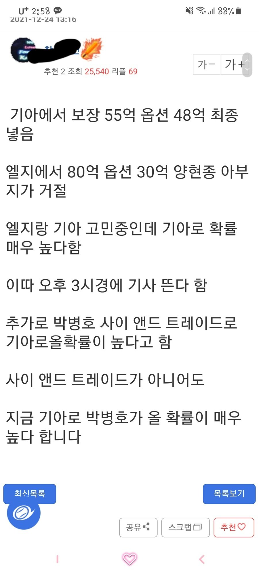 https://sports.v.daum.net/v/20211224154800027 4년 계약금 30억, 연봉 7.25억X4, 옵션 48억, 총 103억. 양현종 보장 55, 옵션 48 저야 아무래도 현종이한테 마음이 가는 사람이라 좀 불만이긴 합니다. 실명은 좀 글코 여타 야수들보다 보장 금액이 한참 낮다는게… 그동안 기아한테 해준게 얼만데… 0