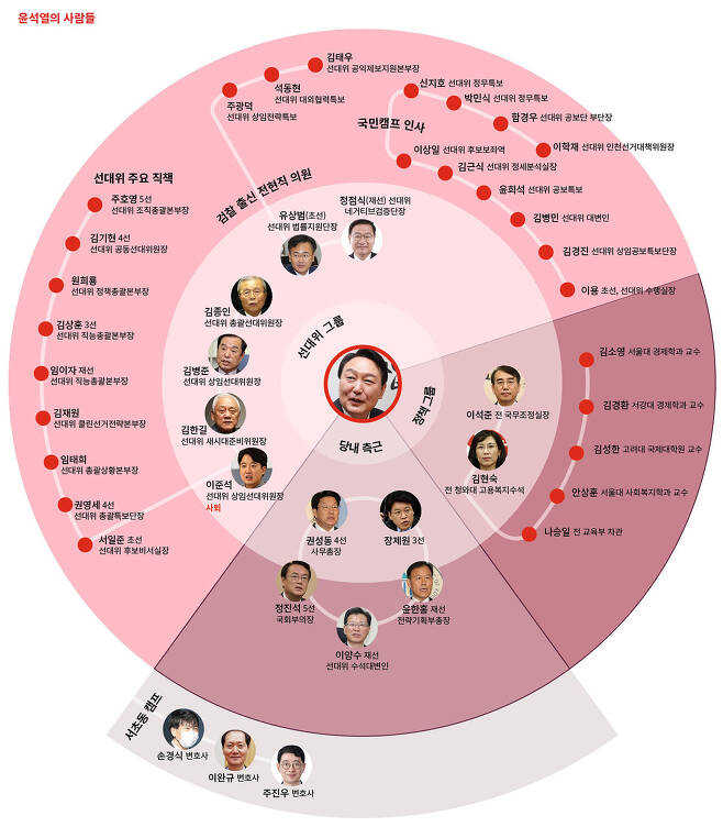 https://news.v.daum.net/v/20220103055723606 “정치는 ‘사람’이 하는 것이 아니라 ‘사람들’이 하는 것이다. 정권교체를 바라는 이라면 누구든 함께 가겠다.” 윤석열 국민의힘 대선후보는 2021년 12월6일 국민의힘 선거대책위원회(선대위) 출범식 당일 SNS에 이런 글을 남겼다. “100가지 중 99가지가 달라도 정권교체의 뜻 하나만 같다면 모두 힘을 합쳐야 한다”라는 윤 후보의 말처럼 현재 그의 곁엔 공식적으로만 수백 명의 ‘사람들’이 포진해 있다. 국민의힘 선대위가 공개한 자료에 따르면, 2021년 12월21일 기준으로 공식 직함을 가진 참모만 400여 명이다. 전현직 의원도 100여 명에 달한다. 윤석열 후보는 2021년 3월4일 검찰총장직을 사퇴한 이후 정치 행보를 시작하며 각계각층 사람들을 만나 도움을 구했다. 각 분야 전문가들과 본인의 ‘안방’인 법조계를 기반으로 외연을 확장했다. 선대위의 한 관계자는 이 과정에서 윤석열 후보의 측근들이 ‘만들어졌다’고 짚었다. 사실상 모두가 윤 후보에게 새로운 사람이란 뜻이다. “윤석열 후보는 정치권에 없었던 인물이다. 물론 검찰총장까지 했으니 아는 정치인은 많겠지만, 직접 정치를 할 때 측근이라고 할 만한 사람들을 소위 ‘보유’하고 있지는 않았다. (측근 중) 일부는 개인적 인연도 있겠지만 결국은 정치 참여 이후에 가까워진 사람들이라고 봐도 무방하다.” 입당 전, '반문' 진영의 상징으로 떠오르면서 : 친이·친박의 수십여명 국회의원이 윤 후보에게 쏠리면서 '친윤계'가 본격 형성. 정진석·권성동·윤한홍·이양수·유상범 등. 국힘 입당 이후 : 정치권 인사들이 전방위로 합류하며 규모가 커짐. 당시 윤캠엔 김태호·박진·심재철·유정복·주호영·하태경이 있었고 주도하는 인물은 권성동·장제원. 국힘 경선 이후 : 당에서 선대위를 지원할 수 있는 모든 역할을 권성동·윤한홍이 나눠서 맡고 있음. 이양수도 윤과 친함. 율사 그룹 : 검찰 인맥. 권영세·권성동·정점식·유상범·주광덕·박민식 등은 모두 검사 출신. 석동현은 대학 동기. 서초동 캠프 : 선대위 공식 직함 없이 외곽에서 윤을 지원하는 법조계 인사들. 이완규·손경식 변호사는 윤의 가족 사건 대리인을 맡고 있는 검사 출신. 주진우 변호사는 법률 관련 업무를 총괄. 윤석열표 정책을 구상하는 사람들 : 이석준 전 박근혜 정부 국무 조정실장(캠프 정책팀 총괄 조율), 김현숙 전 박근혜 정부 고용복지수석(선대위 내부에서 정책을 실질적으로 조율), 김소영 서울대 경제학부 교수(경제정책 담당), 김성한 전 이명박 정부 외교통상부 제2차관(외교안보정책), 안상훈 서울대 사회복지학과 교수(김기춘의 사위)(사회복지 정책), 김경환 서강대 경제학과 교수(부동산 정책), 나승일 전 박근혜 정부 교육부 차관(교육 정책), 정승국·박도준·모종린(외곽에서 자문) 윤석열의 사람들을 쭉 정리한 기사가 있어서 가져왔습니다. 주로 검찰·법조계 인물 및 그 주변, 이명박·박근혜 정부에서 일했던 사람들, 친이·친박 국회의원 등등입니다. 1