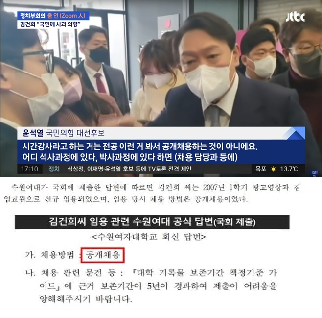 https://news.v.daum.net/v/20220105094731360 더불어민주당은 5일 국민의힘 윤석열 대선후보의 부인 김건희 씨가 2007년 수원여대 겸임교원으로 임용될 당시 공개 채용을 거쳐 임용됐다는 사실을 확인했다면서 '공채가 아니라 자료를 보고 뽑은 것'이라는 윤 후보의 주장이 거짓이라고 밝혔다. 선대위 현안대응TF는 이날 보도자료를 내고 "수원여대가 국회에 제출한 답변에 따르면 김건희 씨는 2007년 1학기 광고영상과 겸임교원으로 신규 임용됐으며 임용 당시 채용 방법은 공개채용이었다"고 말했다. 윤석열 후보는 지난해 12월 15일 권성동의 제지에도 불구하고 굳이 기자들에게 억울함을 토로하며 "겸임 교수 채용은 공채가 아니며, 자료를 보고 뽑는 게 아니다. 현실을 좀 보시라"라고 하소연했고 국민의힘은 지난해 12월 26일 김건희 관련 설명자료에서 김건희의 수원여대 겸임교원 임용 경위에 대해 "다른 교수가 김건희를 겸임 교수로 추천해 위촉했다"고 해명했지만 수원여대가 국회에 제출한 답변에 따르면 김건희 임용 당시 채용은 공개채용이었습니다. 따라서 거짓말을 한것입니다. 김건희 '큐레이터' 경력도 논란..전 대표 "말이 안된다" https://news.v.daum.net/v/20220105073824583 JTBC는 4일 김씨가 큐레이터로 일했다는 시기의 미술관 공동대표 증언을 바탕으로 이같은 내용을 보도했다. 김씨는 1998년 3월부터 2002년 3월까지 큐레이터로 대안공간 루프 미술관에서 근무했다고 기재했으나 1999년 미술관을 만든 서모씨와 공동 대표였던 윤재갑씨 모두 김씨의 큐레이터 경력을 부인한 것이다. 서씨는 다만 2005년쯤 김씨와 2개의 전시 프로젝트 일을 했다고 말했다. 실제로 2005년 서울시립청소년문화교류센터가 주관한 공동 전시회 ‘프로젝트 대기중 000’ 자료를 보면 김씨 개명 전 이름인 ‘시각예술 작가 김명신’이 확인된다. 그러나 이 또한 큐레이터 업무가 아니고 재직증명 기간과도 다르다. 윤씨는 “98년도부터 근무했다는 것도 이제 말이 안 되는 거고. 그분은 큐레이터가 아니었다. 왜냐면 그 루프 큐레이터는 제가 다 알고 있었다. 자원봉사자나 뭐 그런 게 있을 수는 있다”며 김씨가 큐레이터로 해당 미술관에서 활동한 적이 없다고 재확인했다. 김건희가 큐레이터로 일했다는 미술관에서 그녀는 작가로 전시 프로젝트 일을 한것은 맞는데 재직연도가 잘못되었고 큐레이터가 아니었고 4년 근무도 부풀려진 것입니다. 큐레이터로 상시 근무했다는 게 거짓이라는 겁니다. 0