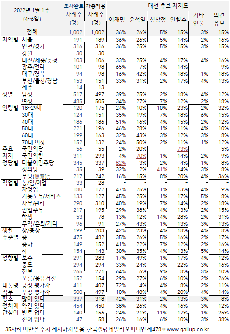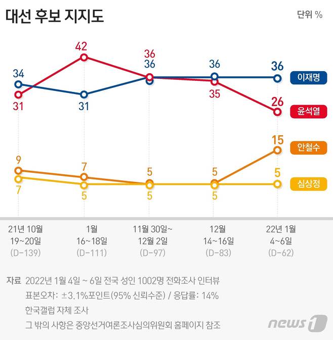 7일 여론조사 전문기업 한국갤럽에 따르면 지난 4~6일 전국 만 18세 이상 유권자 1002명에게 '누가 다음번 대통령이 되는 것이 가장 좋다고 생각하는지' 물은 결과 이재명 36%, 윤석열 26%, 안철수 15%, 심상정 5% 등으로 나타났다. 유권자 중 15%는 의견을 유보했다.