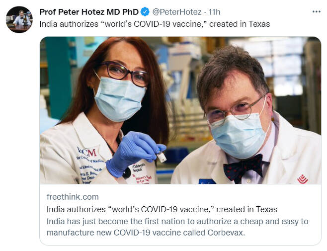 https://news.v.daum.net/v/20220107100607222 https://news.v.daum.net/v/20220108060802578 미 베일러의대-텍사스아동병원 개발 값싸고 보관 간편한 '단백질 백신' 특허 등록 않고 각국에 기술 이전 코르배백스와 다른 코로나19 백신의 차이점은 '특허'다. 코로나19 백신의 불평등 문제가 불거지면서 이를 해결하기 위해 백신 특허 등 지식재산권 보호를 유예해야 한다는 목소리가 커지고 있지만, 백신 제조사들은 이를 쉽게 포기하지 않고 있다. 이유는 막대한 수익이다. 제약사들은 연구 개발비의 수익 인센티브가 없다면 미래에 백신을 만들기 위해 공격적으로 행동하지 않을 수 있다며 백신 지재권 면제를 반대하고 있다. 호테즈 박사는 성명을 통해 "텍사스어린이병원은 코르베백스로 수익을 낼 계획이 없다. 이는 세계를 위한 선물"이라며 "코르베백스의 긴급사용 승인은 전 세계 사람들에게 백신을 접종하고 전염병을 멈추는 데 필요한 첫 단계다. 우리의 백신 기술은 저소득 국가들이 직면한 위기를 벗어날 수 있는 길을 제공할 것"이라고 밝혔다. ▷ 코르베백스 백신 : 미 베일러의대-텍사스아동병원이 개발한 백신. 기술 특허를 포기하였다. 지난해 말 인도가 긴급사용승인한 적이 있다. ▷ '재조합 단백질(항원 합성) 방식'으로 화이자나 모더나의 mRNA방식, AZ와 얀센 백신의 바이러스 벡터 방식과 다르다. 노바백스와 같은 유형이다. 이는 소아 B형 간염, 백일해 등 백신에 수십 년간 사용돼온 기술로, 다른 방식 기반 백신들보다 상대적으로 안전하다는 평가를 받는다. ▷ 유증상 예방 효과가 90%(변이 전 코로나바이러스 기준) 이상이었으며, 코비실드(인도판 AZ백신)보다 이상반응이 50% 이상 적었다. 2차 투여 6개월 후 다른 대부분의 백신은 면역력이 80% 이상 떨어졌으나 이 백신은 30% 이하로 매우 높은 면역 지속력을 보여주었다. 델타 변이의 경우에도 80% 이상의 유증상 감염 예방 효과가 있을 것으로 추정된다. 임상시험 전체 결과는 아직 학술지에 정식으로 발표되지는 않았다. ▷ 텍사스아동병원 연구진은 인도, 인도네시아, 방글라데시, 보츠와나의 백신 생산업체에 기술을 이전했다. 텍사스아동병원은 수익을 낼 계획이 없다고 밝혔다. ▷ 1회 주사 비용이 2.5달러 정도로 값싸고(현재 나온 백신 중 가장 저렴) 보관에도 특별한 냉장시설이 필요 없다. 이 백신 대박인데요?! 게임 체인저가 될수도 있을듯요. 2