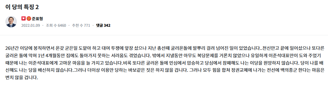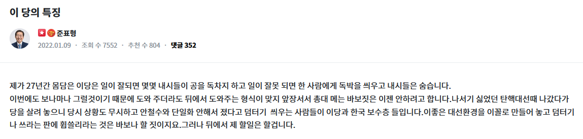 https://news.v.daum.net/v/20220111085135792 https://theyouthdream.com/board_uzdr00 당을 원망 안한다고 하시지만 그동안 맺힌 한이 많으셨나 봅니다.. '野단일화 강조' 홍준표, 安측 만나 "2017년 상황 반복 말라" https://news.v.daum.net/v/20220110173931546 국민의힘 홍준표 의원이 최근 국민의당 안철수 대선 후보의 측근인 권은희 원내대표와 만나 야권 단일화와 관련해 의견을 나눈 것으로 10일 알려졌다. 복수의 전언에 따르면 권 의원은 지난 5일 홍 의원의 국회 사무실을 방문했다. 이 자리에서 홍 의원은 "안 후보에게 2017년 대선 상황을 반복해서는 안 된다는 말을 전해달라"며 단일화 중요성을 거듭 피력했다고 알려졌다. 박근혜 전 대통령 탄핵 이후 치러진 대선 당시 보수진영이 분열되면서 자유한국당과 바른정당이 각각 홍준표 유승민 후보를 냈고, 국민의당에서는 안 후보가 출마했다. 셋의 합산 득표율이 당시 민주당 문재인 후보 득표율을 넘어서면서 야권 분열은 필패라는 인식을 만들었다. 홍준표는 윤석열을 전면에서 적극적으로 돕지는 않겠지만 뒤에서 할일은 한다고 하는데 단일화 관련해서 안철수 측근 만나는 것도 그렇고 완전 손놓고 있지는 않은 모양입니다. 0