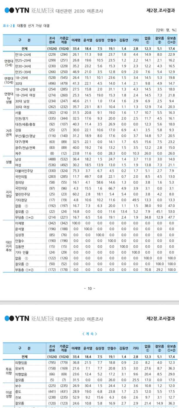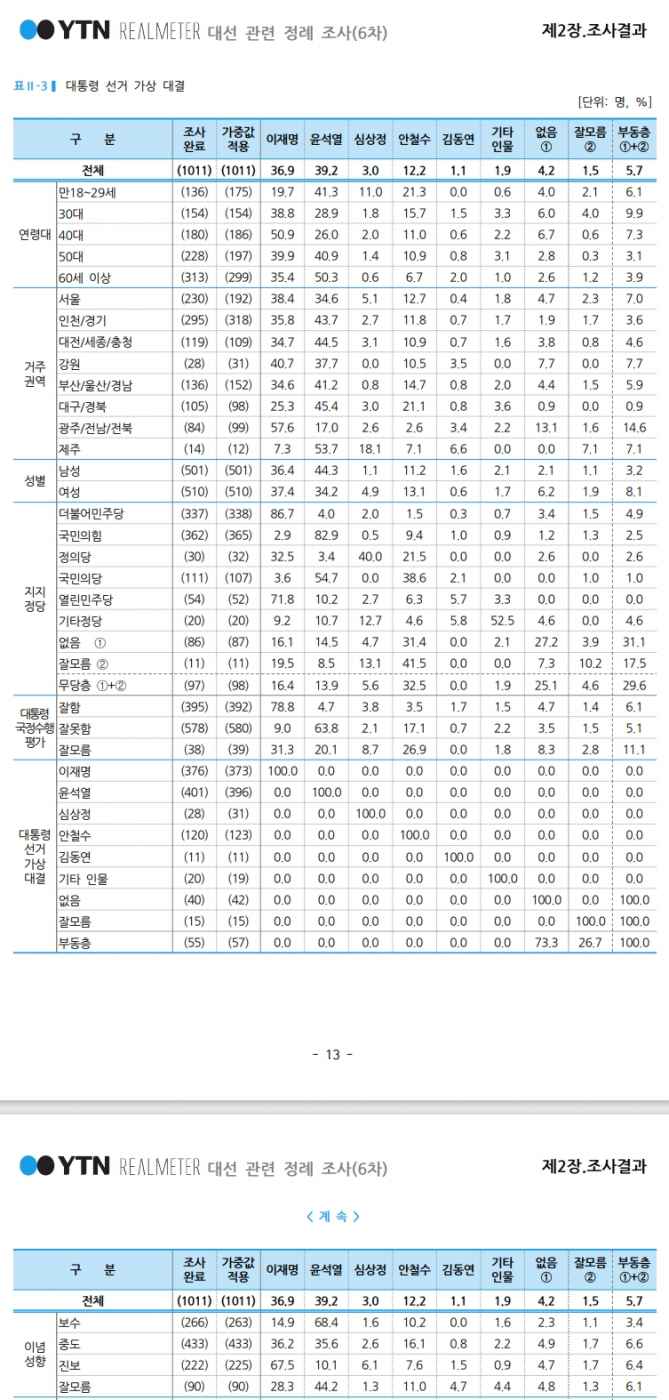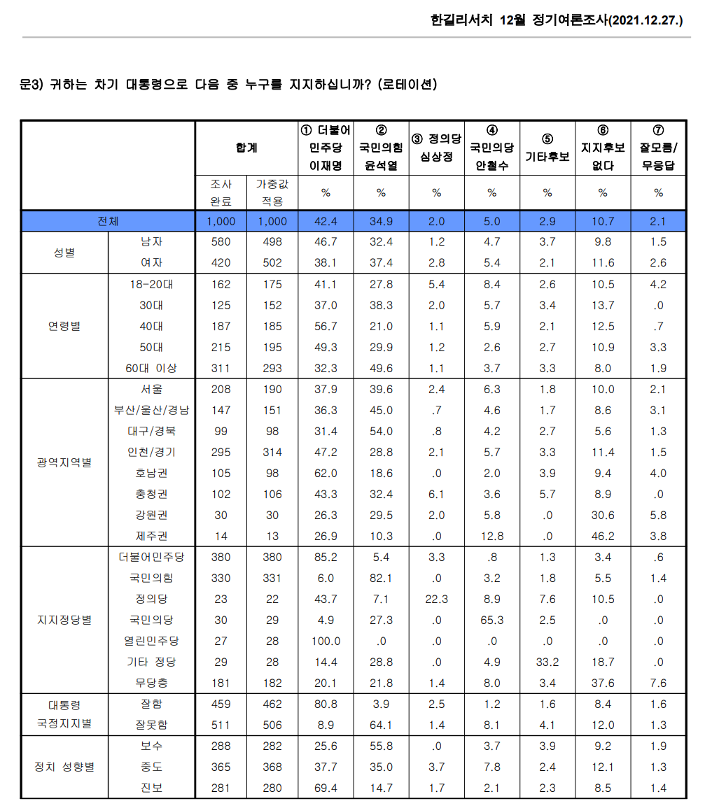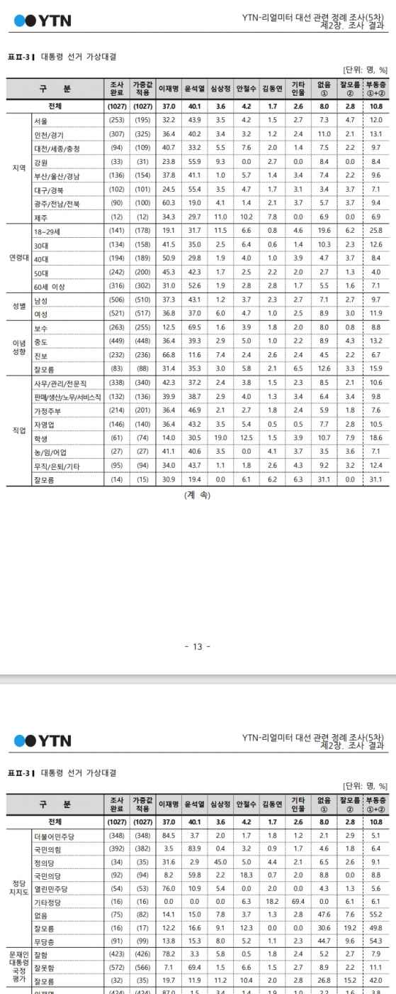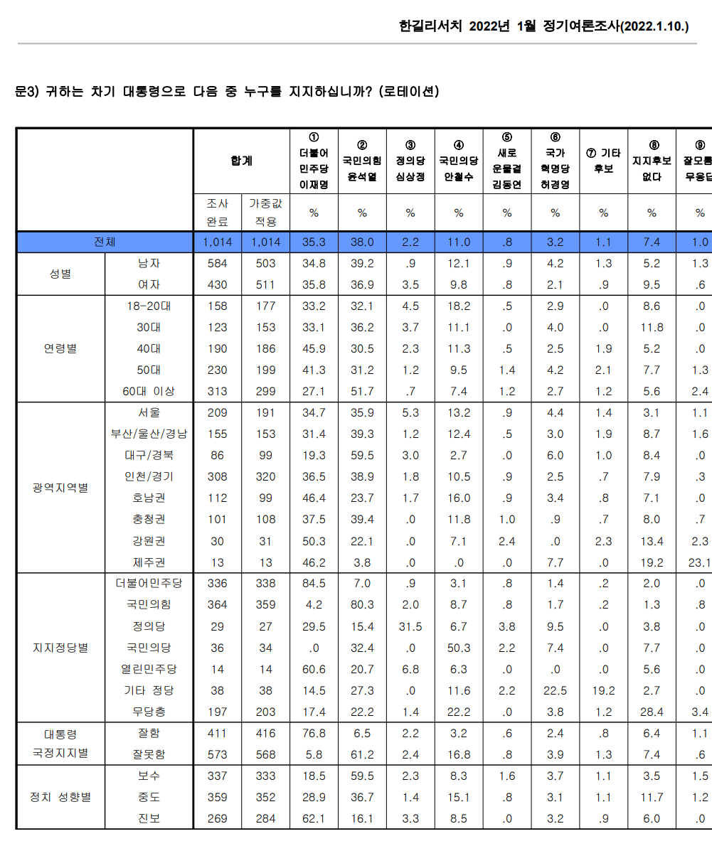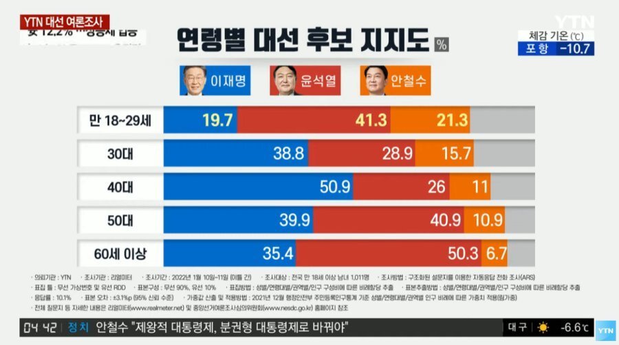 그림은 리얼미터의 세대별 결과입니다. 지난조사인 1/2~1/7 일 조사 와 비교해보면 전체 지지율 이재명 : 40 > 37 윤석열 : 34 > 39 20대 지지율 이재명 : 30 > 20 윤석열 : 26 > 41 30대 지지율 이재명 : 38 > 39 윤석열 : 26 > 28 로 20대에서 드라마틱한 변화가 있었습니다. 이 결과표에서는 4050이 아니라 3040처럼 보이는 면이 있네요. -- http://news.kmib.co.kr/article/view.asp?arcid=0016660859&code=61111111&cp=nv 한길리서치가 쿠키뉴스 의뢰로 지난 8~10일 전국 18세 이상 남녀 1014명을 대상으로 한 여론조사 (표본오차 95% 신뢰수준에 ±3.1% 포인트)에서 윤 후보는 38.0%, 이 후보는 35.3%의 지지율로 집계되었습니다. 두 후보 간 격차는 2.7% 포인트 차로 오차범위 내 접전 양상입니다. 저번 발표된 7~9일간 여론조사는 7일 여론조사가 크게 이슈가 되었던 문제의 7자공약이 저녁즈음 올라오기 전 집표되었던 것으로 젊은층 표심변경을 제대로 반영하지 못하였을 것으로 보입니다. 이 후보의 20대 지지율은 41.1%에서 7.9%포인트 하락한 33.2%, 윤 후보는 27.8%에서 4.3%포인트 상승한 32.1%로, 이 후보의 30대 지지율은 33.1%, 윤 후보는 36.2%로 집계되었습니다. 이 한길리서치의 직전 여론조사는 12월 25∼27일 이루어졌고 이 후보는 7.1%포인트 하락한 반면 윤 후보는 3.1%포인트 올랐으며, 당시 조사에서 이 후보(42.4%)가 윤 후보(34.9%)를 오차범위를 넘어서는 격차로 우세를 보였었습니다. 야권 단일화가 윤 후보로 이뤄졌을 경우 이 후보와의 양자대결 가상 설문에선 윤 후보가 45.2%, 이 후보는 38.8%로 오차범위 밖 격차가, 안 후보로 단일화된 경우 이 후보와 양자대결 시 안 후보는 41.2%, 이 후보는 37.9%로 오차범위 내 격차가 나타났습니다. -- 여론조사는 하나만 봐서는 의미가 없죠. 오늘 발표된 여론조사는 두가지가 있습니다. 쿠키뉴스 의뢰 한길리서치, YTN의뢰 리얼미터. https://www.ytn.co.kr/_ln/0101_202201121529353672 이는 YTN의 정례여론조사입니다. 다자 대결 구도로 보면 윤석열 후보가 39.2%, 이재명 후보가 36.9%, 그리고 심상정 후보 3%, 안철수 후보가 12.2%, 김동연 후보 1.1%. 입니다. 안 후보로 단일화할 경우 가상 대결에서 안 후보가 42.3%로 이 후보(33.2%)보다 오차범위 밖인 9.1%포인트 차이로 앞섰고, 심 후보는 4.5%, 김 후보는 1.7%. 윤 후보로 야권 단일 후보를 가정했을 때에는 윤 후보 43.6%, 이 후보 38.1%로 오차범위내인 5.5%포인트 차이로 접전, 심 후보 4.3%, 김동연 후보 1.5%였습니다. https://www.yna.co.kr/view/AKR20220112032851001?input=1195m 0