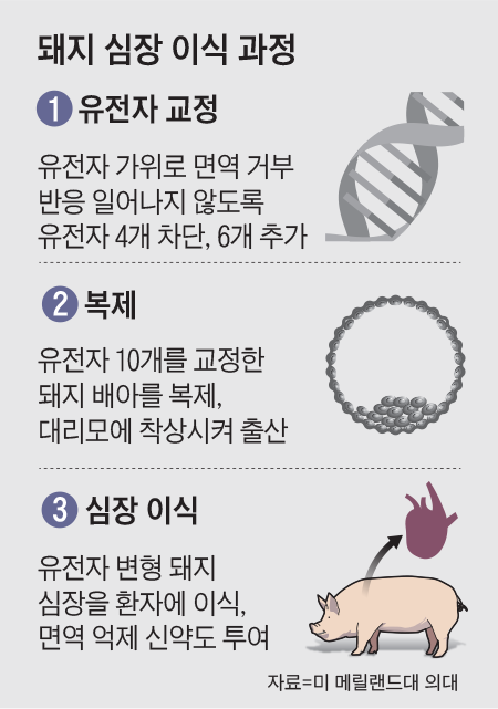 인체의 면역 체계에 순응하도록 돕는 인간 유전자 6개는 추가하고 이식한 심장이 더 자라지 못하도록, 성장 유전자 하나는 기능을 차단했다. 이렇게 유전자를 교정한 세포를 복제해 이식용 장기를 공급할 돼지 수를 늘렸다. 수술을 집도한 바틀리 그리피스 박사는 “이식용 장기 부족 문제를 해결하는 데 한 걸음 가까이 간 획기적 수술”이라고 밝혔다.