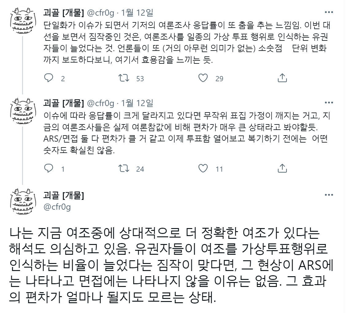 ![]() https://news.v.daum.net/v/20220113113431114 http://nbsurvey.kr/archives/3940 대통령 국정운영 평가 – 긍정적 평가 44%, 부정적 평가 50% 정당지지도 – 더불어민주당 35%, 국민의힘 30%, 국민의당 8%, 정의당 4%, 열린민주당 2%, 태도유보 20% 투표 참여 의향 – ‘반드시 투표할 것’ 적극적 투표층 80% 대선후보 지지도 – 이재명 37%, 윤석열 28%, 안철수 14%, 심상정 3%, 태도유보 17% ☞ 이재명이 윤석열보다 9%p 높게 나타남 대선후보 지지 이유 – 이재명 지지 이유 : ‘후보 개인의 자질과 능력’(43%), ‘정책이나 공약이 마음에 들어서'(21%) 등의 순 – 윤석열 지지 이유 : ‘정권교체 위해‘(70%) 대선후보 지지 강도 – 계속 지지할 것이다 70%, 지지 후보를 바꿀 수도 있다 29% 대선 당선 전망 – 이재명 48% > 윤석열 27% 대통령선거에 대한 인식 – 국정 안정론 42%, 정권 심판론 45% 경제 분야 능력 평가 – 이재명 43%, 윤석열 18%, 안철수 15%, 심상정 2% 등의 순 정부의 코로나19 방역 대응 평가 – 긍정적 평가 58% > 부정적 평가 40% ☞ 긍정적 평가 지난 12월 5주 조사 대비 비슷한 수준 코로나19에 대한 시민들의 상황 인식 – 심각하다 68% > 심각하지 않다 31% ☞ ‘심각하다’는 인식 지난 12월 5주 조사 대비, 10%p 낮아짐 ● 조사지역: 전국 ● 조사기간: 2022년 1월 10일 ~ 1월 12일 ● 조사대상(모집단): 만 18세 이상 남녀 ● 조사방법: 국내 통신 3사가 제공하는 휴대전화 가상번호(100%)를 이용한 전화면접조사 ● 표본추출: 성·연령·지역별 층화확률추출 ● 표본크기: 1,000명 (가중값 적용 사례수 : 1,000명) ● 피조사자 선정방법: 성·연령·지역으로 층화된 가상번호 내 무작위 추출 ● 응답률: 29.3% (총 3,413명과 통화하여 그 중 1,000명 응답 완료) ● 접촉률: 23.3% ● 가중치 산출 및 적용: 성・연령・지역별 가중치 부여(셀가중) – 2021년 12월말 행정안전부 주민등록인구 통계 기준 ● 표본오차: 95% 신뢰수준에서 ± 3.1% point ● 조사기관: 엠브레인퍼블릭ㆍ케이스탯리서치ㆍ코리아리서치ㆍ한국리서치 자세한 사항은 nbs여론조사 홈페이지 또는 중앙선거여론조사심의위원회 홈페이지 참조. 윤석열의 2030민심을 얻기 위한 태세전환 이후 첫 전화면접 조사 같은데.. 특별히 여론이 바뀐 것이 감지되지는 않습니다. 0