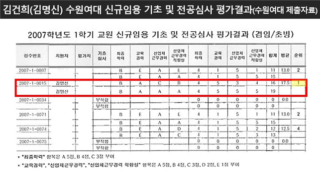 - 수원여대가 김건희씨의 수원여대 신규임용 기초 및 전공심사 평가결과를 공개했다. 당시 지원자는 6명이었으며 김건희씨는 여기에서 평균 17.5점을 받아 1순위로 평가받았다.