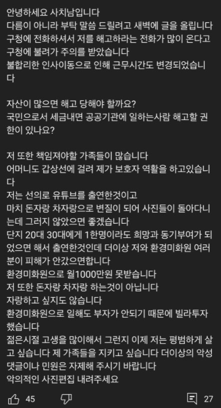 사회적 지위가 낮은 직업임에도 불구하고 좋은차 타고 자산가가 되어서인지 더 죽창질 당하시는것 같네요