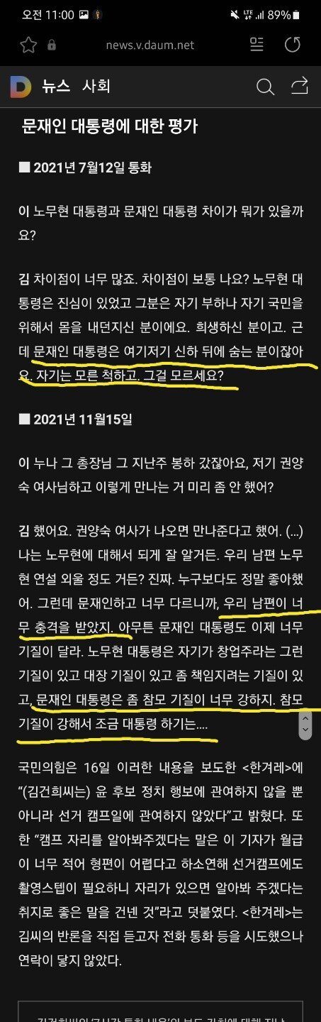 https://news.naver.com/main/read.naver?mode=LPOD&mid=sec&oid=001&aid=0012921709&isYeonhapFlash=Y&rc=N 왜 국힘이 이걸 막으려고 발버둥을 친건지 도무지 이해가 안 가는 방송이었습니다. 순정남 윤후보가 사랑하는 부인이 언론에 나오는 것을 끔찍히 싫어해서 김기현한테 노성을 질러서 막으라고 했다는 뇌내망상 외에는 이유를 찾을 수가 없네요. 개인적으로 김건희 리스크는 이제 끝났다고 생각합니다. 김건희 싫어서 윤석열 못 뽑겠다는 사람들은 이미 다 나간 것 같네요. 개인적인 오늘의 승리자 1. 김건희 오늘의 패배자 1. 가세연 2. 김종인 3. 진중권 4. 김기현 5. MBC 0