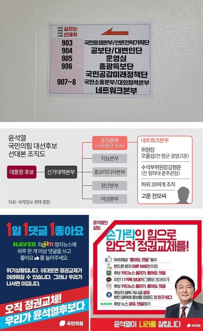 - <프레시안>이 18일 입수한 5분가량의 동영상에 따르면(*검색해도 찾을 수 없는 것을 보니 유튜브 등에 공개적으로 올리지는 않은 모양) 김형준 당시 국힘 중앙선대위 총괄지원본부 산하 네트워크본부 수석부본부장이 선거 조력원들에게 네트워크본부의 구성과 역할을 상세하게 설명하는 부분이 있다. :