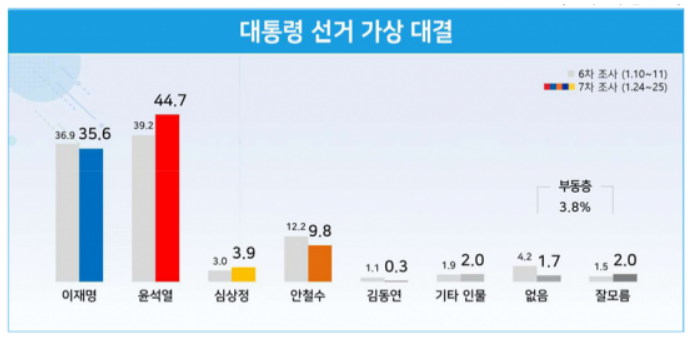 윤석열 44.7% 이재명 35.6% 안철수 9.8% [리얼미터]