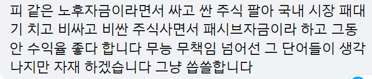 당신의 국민연금과 연금저축펀드, 월가의 코카인으로 대체되었다 코-카-인 코코카인 https://www.news1.kr/articles/?4568702 IPO '공룡' LG에너지솔루션(이하 LG엔솔)의 상장 첫날, 외국인 기관투자자들이 미확약물량 중 287만8000주를 대거 순매도했다. 외국인 미확약물량은 이론적으로 상장 첫날부터 매도 가능하지만 실제로 상장 첫날부터 이 정도의 대량 매물이 나온 것은 이례적이다. 더구나 외국인의 매도물량을 국민연금을 위시한 연기금이 모두 '비싼 값'으로 사들인 것으로 나타났다. 이날 연기금은 총 399만8000주, 2조1062억원어치를 사들였다. 평균 매수단가는 52만6869원으로 추정되는데, 이는 외국인이 판 51만5586원보다 더 비싼 가격이다. "연기금의 평균 매수단가가 외국인의 평균 매도단가보다 높다. 즉 외국인이 판 물량을 연기금이 비싸게 사준 형국"이라면서 "삼성전자, 네이버, 현대차 등 우량주를 1월 내내 팔면서 대형주 하락을 주도한 연기금이 이날 LG엔솔은 비싼 가격으로 대량매집한 행위를 보였는데 상식적으로 이해가 잘 가지 않는 패턴" https://www.chosun.com/economy/money/2022/01/27/PHXTGGJNE5HXNLUIOHUHWUQSLY/ 연기금은 지난 13일부터 10거래일 연 팔자세였다. 그런데 이날은 오전부터 순매수 신호를 보냈는데, 결론적으로 연기금은 구원투수가 아니라 빌런이었다. 이날 연기금은 오로지 코스피 시가총액 2위(118조원)에 올라선 LG엔솔만 집중 매수했기 때문이다. 기업 실적과 가치와는 상관없는 기계적인 매수였다. 모처럼 주식 쇼핑에 나선 연기금이 순매수한 LG엔솔 금액만 2조1062억원에 달했다. 삼성전자를 비롯한 대다수 코스피 대형주에선 연기금의 ‘팔자’가 이어졌다. 연기금은 이날 하루만 삼성전자 주식을 1763억원 어치 순매도했고, SK하이닉스는 610억원, LG화학도 633억원 어치 순매도했다. 이날 연기금은 한국 증시를 방어하긴커녕, 오히려 끌어내렸던 주요 주체였던 것이다. 이날 LG엔솔 공모주 청약에 참여한 외국인 투자자들이 벌어들인 수익은 9231억원에 달한다. 국내 기관들은 대부분 일정 기간 주식을 팔지 않겠다고 의무보유 확약을 했지만, 외국인 투자자의 의무보유 확약 비율은 27.1%에 불과했다. 증권업계 관계자는 “지수를 추종해야 하는 연기금 입장에선 (LG엔솔)을 매수할 수 밖에 없겠지만, 연기금이 기존 보유 주식을 무차별 매도하고 그 자금으로 LG엔솔만 집중적으로 사는 바람에 시장이 전체적으로 망가지고 말았다”고 말했다. 관련해서 좋은 글 https://www.facebook.com/jungchejin/posts/3198866017016550 0