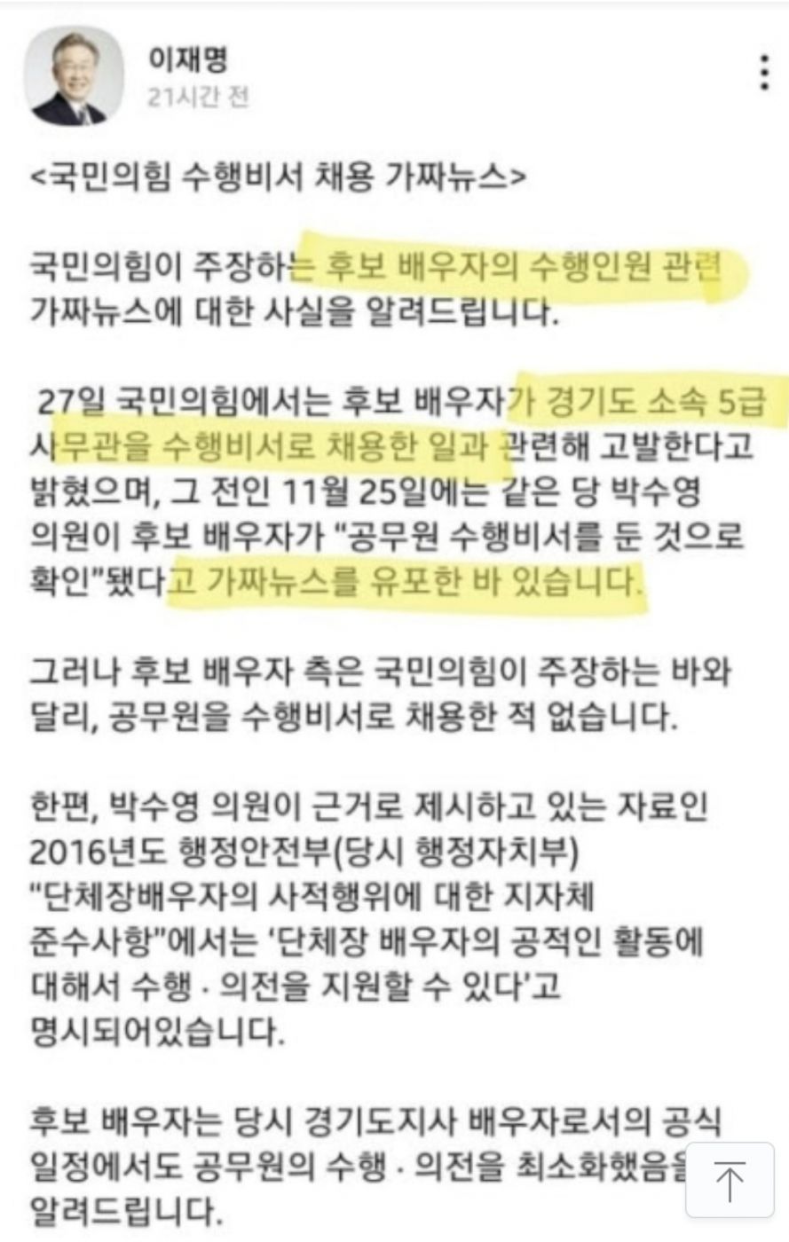 Subject   이재명, ‘김혜경 비서 채용은 가짜뉴스’ 페북글 왜 지웠나