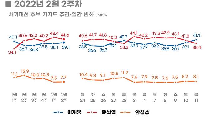 주간 조사 결과자체는 윤 41.6 vs 명 39.1로 윤이 살짝 앞섭니다.