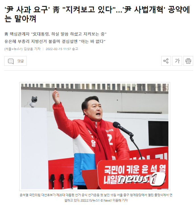 Subject   '尹 사과 요구' 靑 "지켜보고 있다"…'尹 사법개혁' 공약에는 말아껴