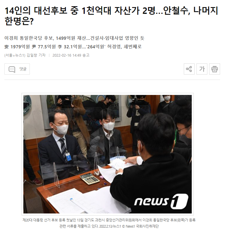 | Subject | 14인의 대선후보 중 1천억대 자산가 2명…안철수, 나머지 한명은? |
