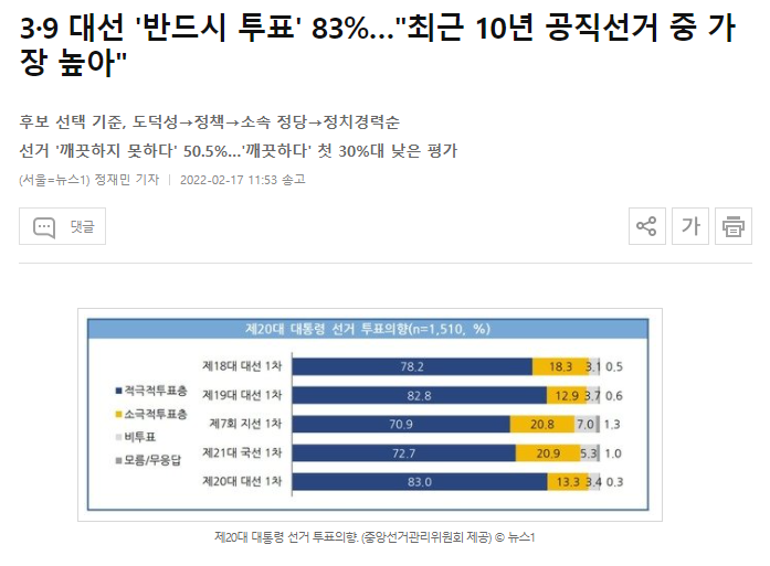 https://www.news1.kr/articles/?4587957 중앙선거관리위원가 여론조사 전문업체 한국갤럽에 의뢰해 유권자 1510명을 대상으로 지난 7~8일간 실시한 '대통령 선거 관심도 및 투표 참여 의향 등에 관한 여론조사' 결과, 응답자의 83.0%가 '반드시 투표할 것'이라고 답했다. 여론조사의 자세한 사항은 중앙여론조사심의위원회 홈페이지에서 확인하면 된다 제 생각보다는 비율이 높네요~!(신기방기) 0
