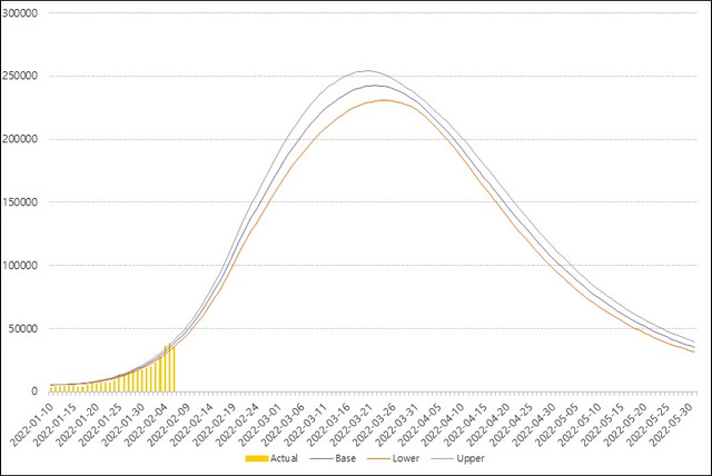 앞서 국가수리과학연구소는 다음달 초 하루 신규 확진자수가 최대 36만명에 이를 수 있다는 예측을 내놓기도 했다. 또 국가수리과학연구소의 심은하 숭실대 수학과 교수는 전날 라디오 인터뷰에서 정점 시기, 규모에 대해 "3월 중반쯤 27만명 가량 나오지 않을까 싶다"고 전망했다.