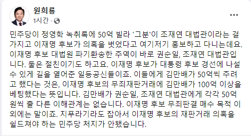 녹취록 공개로  천화동인 1호가 받아야할 배당금 중 일부를 유동규가 받기로 한 게 드러났고 나머지 주인은 누구냐는 얘기입니다.  그리고  녹취록에 언급된 50억 빌라를 받은 대법관 때문에 이재명의   의혹이 더 커졌다는 내용이고요. (이건 아래 원희룡 지사의 얘기에서도 나옵니다)