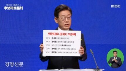 앞서 우상호 민주당 총괄선대본부장은 지난 20일 대장동 의혹의 핵심 인물인 화천대유 대주주 김만배씨와 정영학 회계사가 나눈 통화 녹취록 일부를 공개했다. 녹취록에는 “영장이 들어오면 윤석열은 죽는다”, “윤석열은 원래 죄가 많은 사람” 등의 발언이 담겼다. 이재명 민주당 대선 후보는 전날 대선 후보 3차 TV토론에서 이 같은 발언이 적힌 손팻말을 들며 윤 후보의 대장동 연루 의혹을 제기했다.