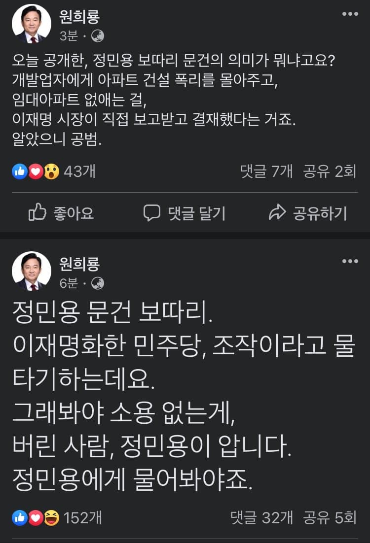 "재판 과정에서 성남시청 직원들은 '비서실로 들어왔다', '구체적인 결재 경위는 모르겠다'는 식으로 이재명 시장과 정민용 팀장의 직접 대면 사실, 독대 사실, 결재 사실을 흐리고 있지만, 화천대유 관계자들의 녹취를 통해 정민용이 결정적인 공을 세운 것으로 인정이 됐다"