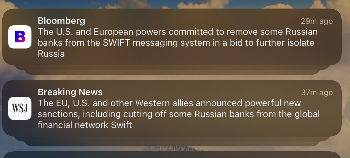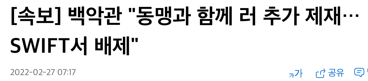 가장 강한 제재 중 하나로 꼽히지만, 양날의 칼이라 반대하거나 주저하던 나라들이 많았는데, 주말 사이에 많은 나라들이 퇴출 찬성 쪽으로 돌아서고 있습니다. 생각보다 빨리 퇴출될 가능성이 얘기되고 있습니다. 월스트리트 쪽에서는 반대하는 목소리가 나오기도 합니다. 러시아 쪽도 과거 경험이 있어서 일부라도 대체하기 위한 시스템을 마련했다고 합니다만, 그래도 SWIFT에서 퇴출되면 여파가 매우 클 것 같습니다.
