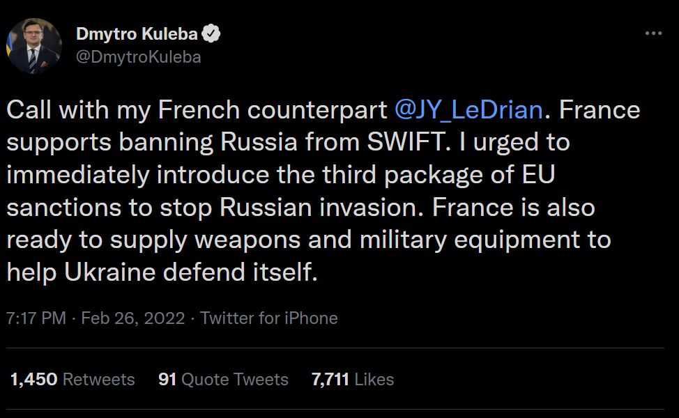 우크라이나 외무 장관에 따르면, 프랑스도 퇴출 동의로 바뀐 것 같습니다.
