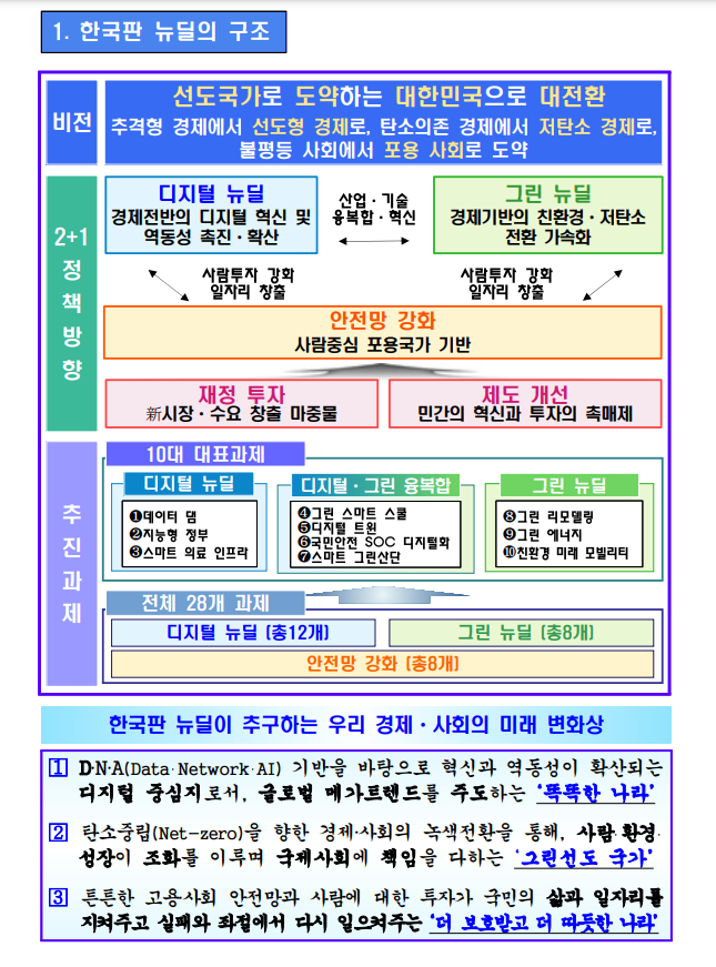 지난 대선 토론 때도 RE100이나 그린 텍소노미가 큰 이슈였었는데 전세계적으로 중요시되고 있는 문제들을 복합적으로 다루는 것이 한국판 뉴딜로 알고 있습니다. 한국판 뉴딜 사업은 2025년까지 220조 예산이 편성되어 있습니다.