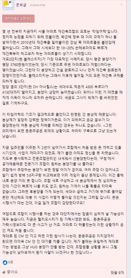 https://www.hankyung.com/realestate/article/2022041213671?fbclid=IwAR0DsyIh05shz_20zX2Dnpm7BA5VunZHrULQ5-e9pR38OFKOkyhvR1eCFuo 둔촌주공이 결국 공사중단됐군요. 조합측이 생각하는 공사비와 시공사측이 요구하는 공사비가 1조 가까이 차이가 났으니 당연한 순서죠. 후분양까지 생각하며 HUG분양보증 안 받고 착공 들어갔으니 당연히 조합측도 이 재건축을 통해 누리고 싶은 이익이 장난 아닌거고 그동안의 이주비, 공사비 다 대출받아 짓는거니 대주들이 중간에 먹는 대출이자도 커버가 되어야 하고 시공사 입김도 커지고 안그래도 공사중단 할 때 된거같은데 대주한테 돈을 얼마나 많이빌렸나 잘 올리네 싶더라니.... 이런 사태가 처음이라고 하기에는 이미 예견되었던거 아닌가 싶네요. 1