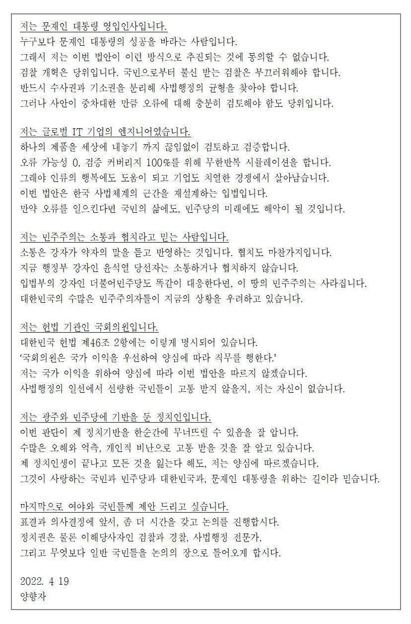 온라인에서 양향자의 검수완박 반대 입장문이 돌았었지요.