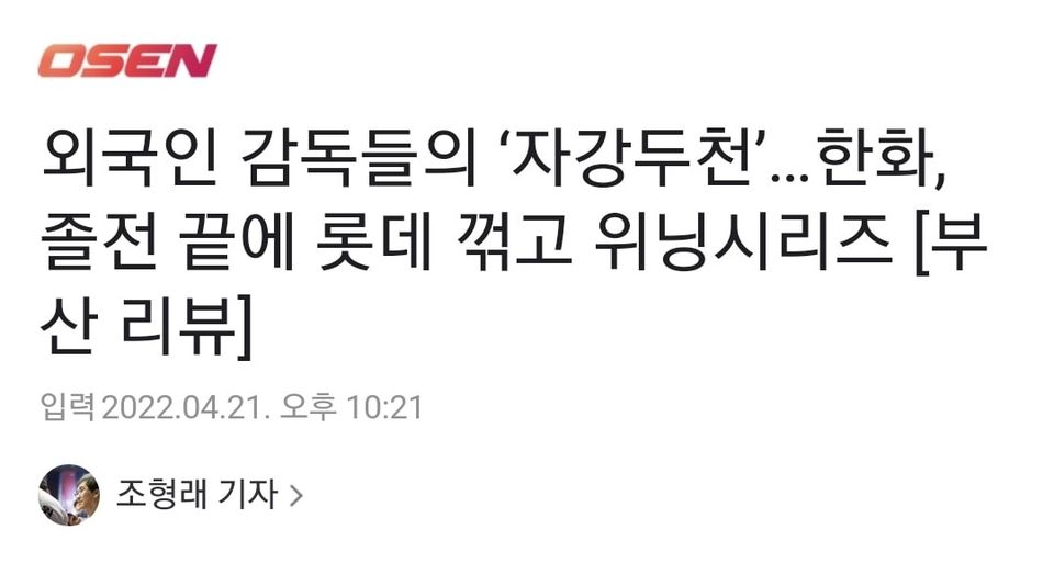 스포츠외국인 감독들의 ‘자강두천’…한화, 졸전 끝에 롯데 꺾고 위닝시리즈 4 |