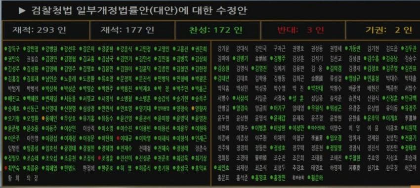 30일 오후 개최된 국회 본회의에서 ‘검수완박’ 관련 검찰청법 개정안이 찬성 172표, 반대 3표, 기권 2표로 국회를 통과했다. 더불어민주당과 박병석 국회의장은 검찰청법 개정안이 처리되자, 바로 ‘회기 쪼개기’ 안건도 상정해 통과시켰다