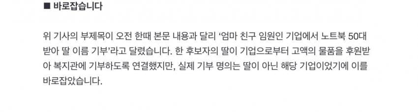 앞서 한 후보자는 보도 직후 "딸의 이름으로 기부했다는 한겨레 보도는 사실이 아니다"라며 "정상적인 봉사활동을 무리한 프레임 씌우기로 폄훼한 것"이라고 유감을 표한 바 있다.///