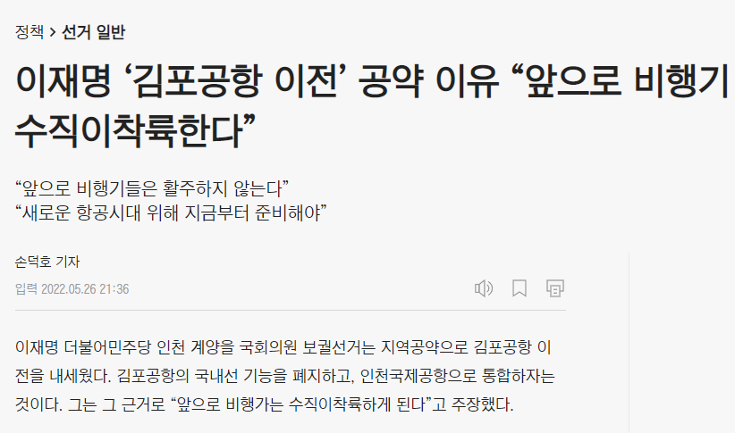https://n.news.naver.com/mnews/article/448/0000361431 이재명, 송영길 후보가 김포공항을 인천공항과 통폐합하겠다는 공약을 발표한 데에 대해 민주당 제주도 지역구 의원들 및 제주도지사 후보가 '김포공항 이전 공약 반대' 공동 기자회견을 한다고 합니다. 당의 총괄선대위원장이 내놓은 정책 방향에 지역에서 대놓고 반기를 든 건데요, 이럴 수밖에 없는 이유가. 이재명, 송영길 후보가 내놓은 김포공항 이전 공약이 제주 지역경제에 막대한 타격이 불가피한 부분이라 막판 표심이 요동치고 있는 상황이기 때문입니다. https://n.news.naver.com/mnews/article/421/0006123802 당장에 이준석 대표가 이 이슈를 덥석 물면서 "왜 계양 선거에서 제주도 관광산업을 고사시키겠다는 발상의 선언을 하는지 잘 모르겠다"고 꼬집은 다음 오늘 제주국제공항까지 가서 '제주 관광산업 말살 저지' 긴급 기자회견을 열고 이재명 후보의 김포공항 이전 발언을 규탄한다고 하니 말 다했죠. 송영길, 이재명이 하는 짓거리 보면 송영길은 앞뒤 안 가리고 정신 못 차리고 트롤링에 기망행위나 하고 있고 이재명은 총괄선대위원장이라는 작자가 당의 선거 지원을 해주기는 커녕 당 문제는 발뺌하고 지 살겠다고 다른 지역 망치는 정책들이나 내놓고 자기 선거도 빌빌거리면서 당의 지원을 지 혼자 빨아먹고 있지요. 제 눈에는 김한길-안철수보다 더 심하면 심했지 덜하지 않은 환장의 듀오 같습니다. 0