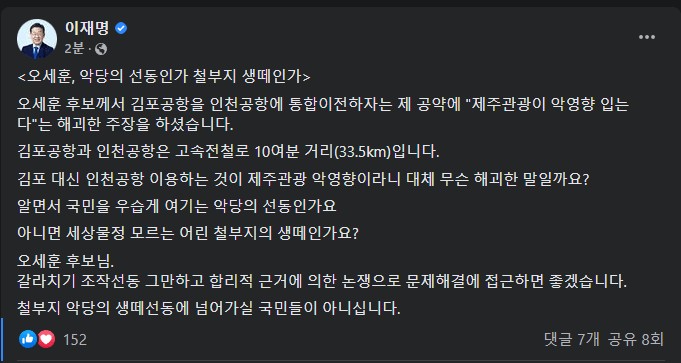 | Subject | 송영길 “김포공항 이전하고 KTX로 제주까지 연결할 것” |