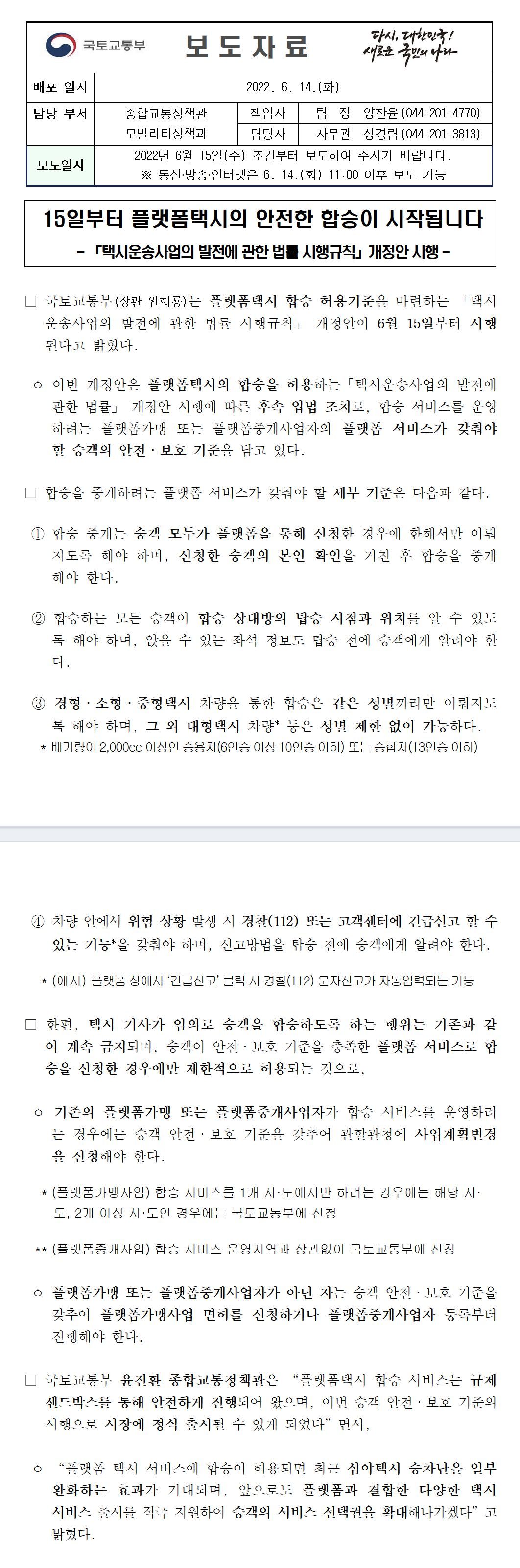https://www.yna.co.kr/view/PYH20220614156000013 http://www.molit.go.kr/USR/NEWS/m_71/dtl.jsp?lcmspage=1&id=95086831 기본적으로 동성 합승만 허용이라고 합니다?! 대형택시 등은 성별 제한이 없습니다. 15일부터 시행됩니다. 0