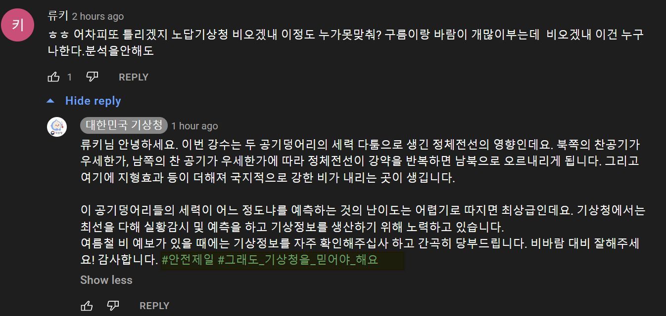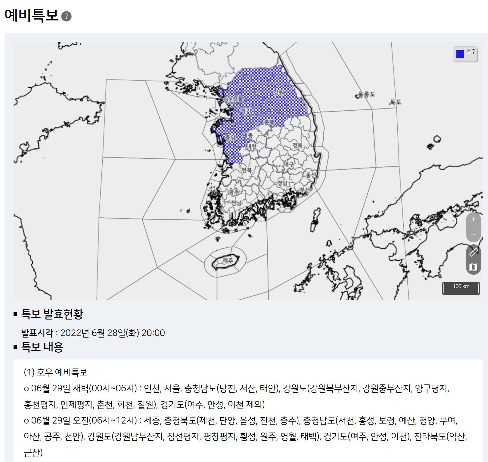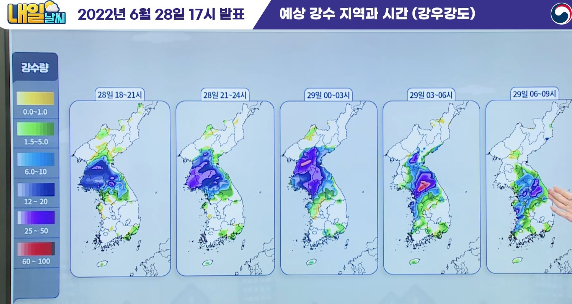 https://www.yna.co.kr/view/AKR20220628169700530 취약 시간인 밤부터 내일 아침 사이, 중부지방에 강하고 많은 비가 올 것으로 예상된다고 합니다. 가물었다가 갑자기 비가 와서 산사태가 우려되는 곳도 있으니 안전에 주의하시기 바랍니다. https://youtu.be/HppI18qNATk 0