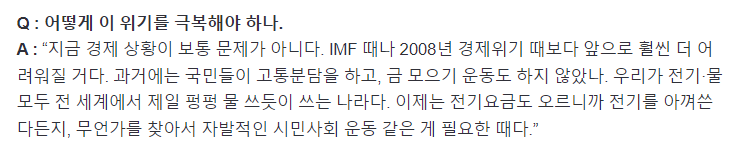https://n.news.naver.com/mnews/article/025/0003207939?sid=100 인플레이션 및 자원위기 해결을 위해 소비를 둔화시킨다? 아름다운 이야기죠. 그런데 요즘 같은 살인적인 더위에 제습기+에어컨 안 쓰고 사람다운 생활이 가능한가요? 그것마저 없는 취약계층들은 찬물샤워라도 안 하면 살 수도 없죠. 물, 전기 쓰는 국민들을 죄악시하는 시각이라... 이건 비단 안철수 뿐만 아니라 여당과 정부 관료들도 은근슬쩍 드러내는 가치관이던데 자유시장경제를 주창하면서 도대체 소비할 자유는 어디에 있는지요? 2