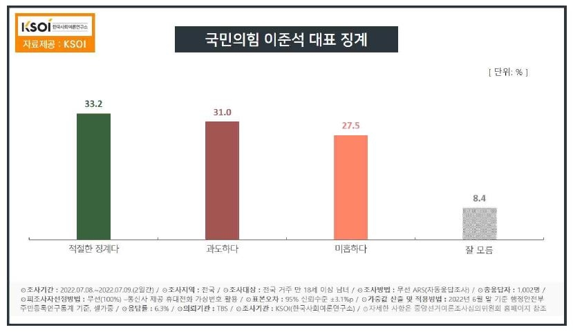 (KSOI 여론조사) '이준석 징계' 여론…적절 33.2% 과도 31% 미흡 27.5%