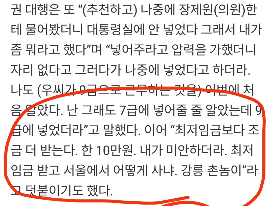 권 대표 대행은 "나는 그래도 7급에 넣어줄 줄 알았는데 9급에 넣었더라"면서 "(해당 직원은) 최저임금보다 조금 더 받는다. 내가 미안하더라"고 덧붙였습니다.