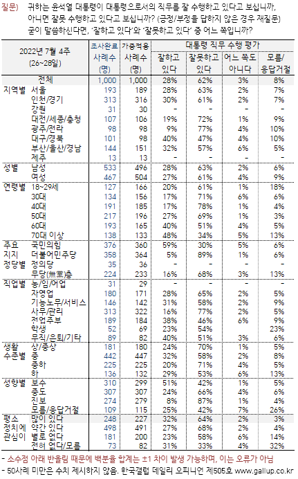 정치[한국갤럽]윤석열 대통령 직무수행 긍정률 28%···30%선 붕괴 21 |