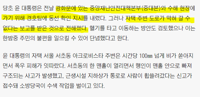 Subject   대통령실, '자택 폭우 대응' 野 비판에 "대통령 있는 곳이 상황실"