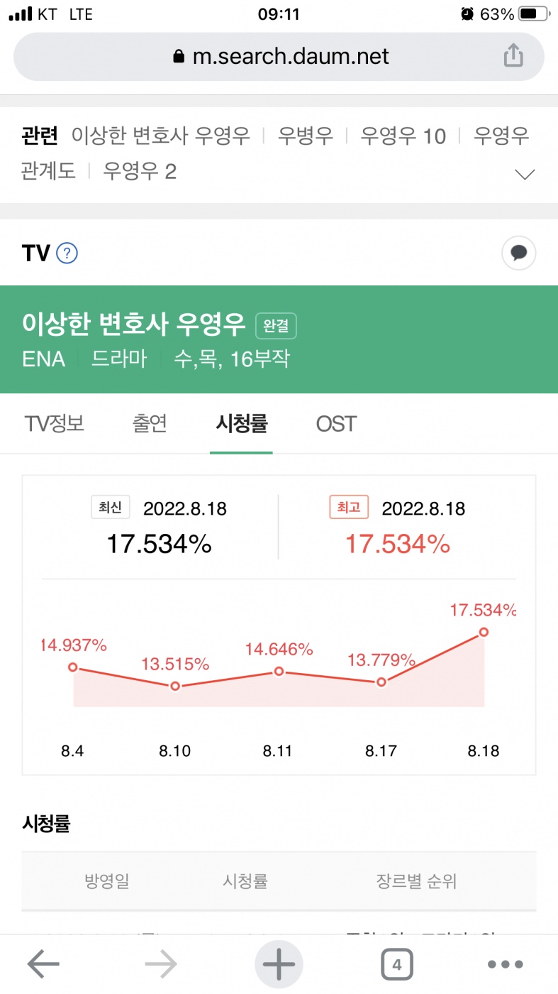 https://entertain.v.daum.net/v/20220819090321494 이래저래 말은 많았어도 마지막회를 깔끔하게 마무리 해서인지 자체 최고, 전방송 통털어도 놀라운 수치로 마무리 했습니다. 최근 17.5 이상 나온 푸로그램은 kbs 주말, 일일드라마 빼고는 우영우가 유일하고 화제성 하나눈 두둑히 챙기고 퇴장 했습니다. 후반회차에서 쬠만 힘 받었어도 20은 찍었을텐데 참 아쉽… ㅜㅜ 1