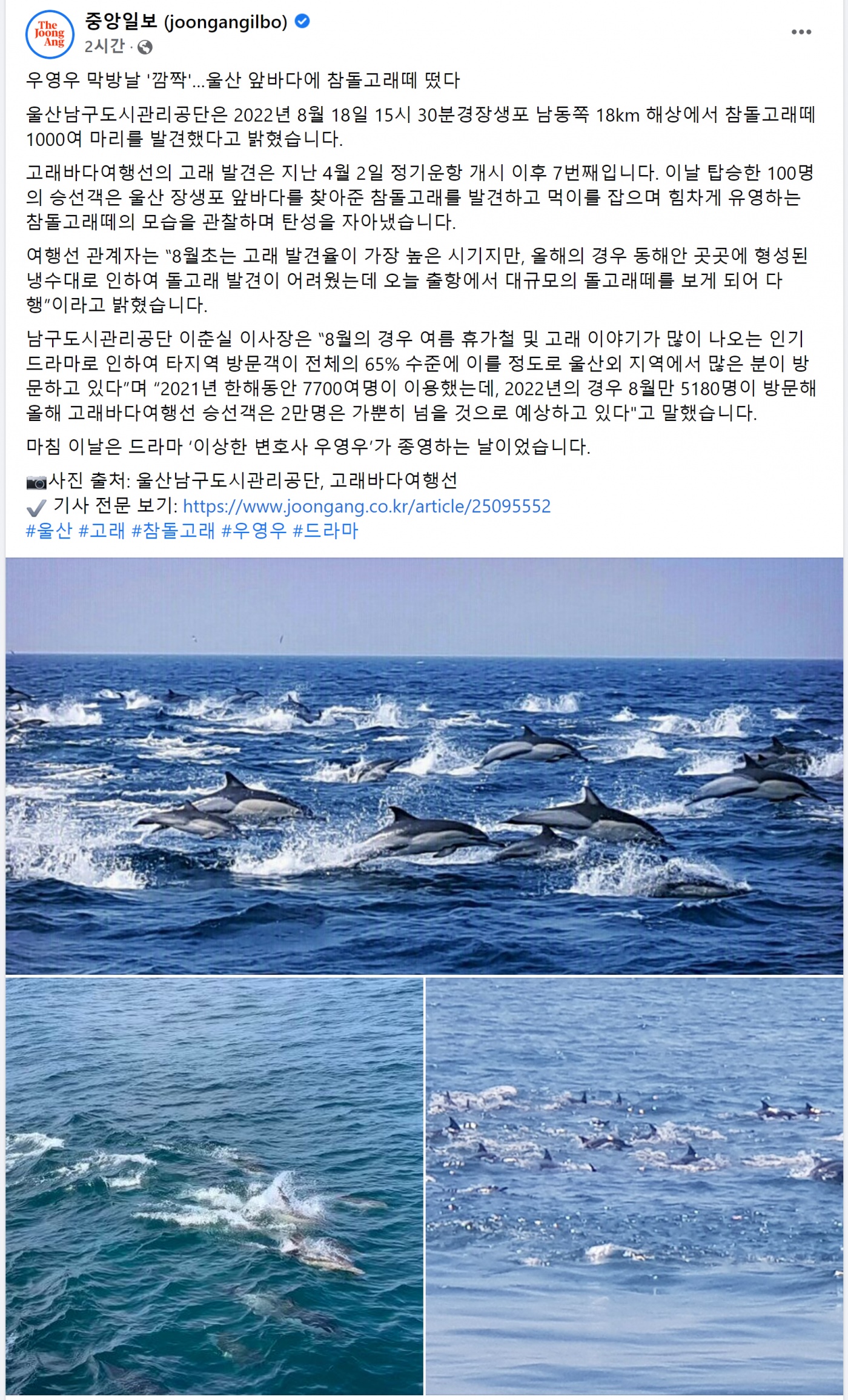 문화/예술우영우 막방날 '깜짝'…울산 앞바다에 참돌고래떼 떴다 2 |