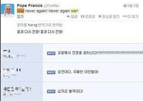 .... 가 아니라 공식적으로 전쟁을 반대하던 교황께서도 결국 우크라이나가 러시아의 침략행위에 대응하기 위해 무기를 가져가는 것은 불가피하다고 결론을 내리신 듯 하군요. 사실 바티칸 자체가 과거 전쟁을 유발한 역사적 과오도 있고 해서 이런 발언 하는건 조심스러웠을 거고, 특히 현 교황께서는 더 그런거 싫어하셨을 텐데...