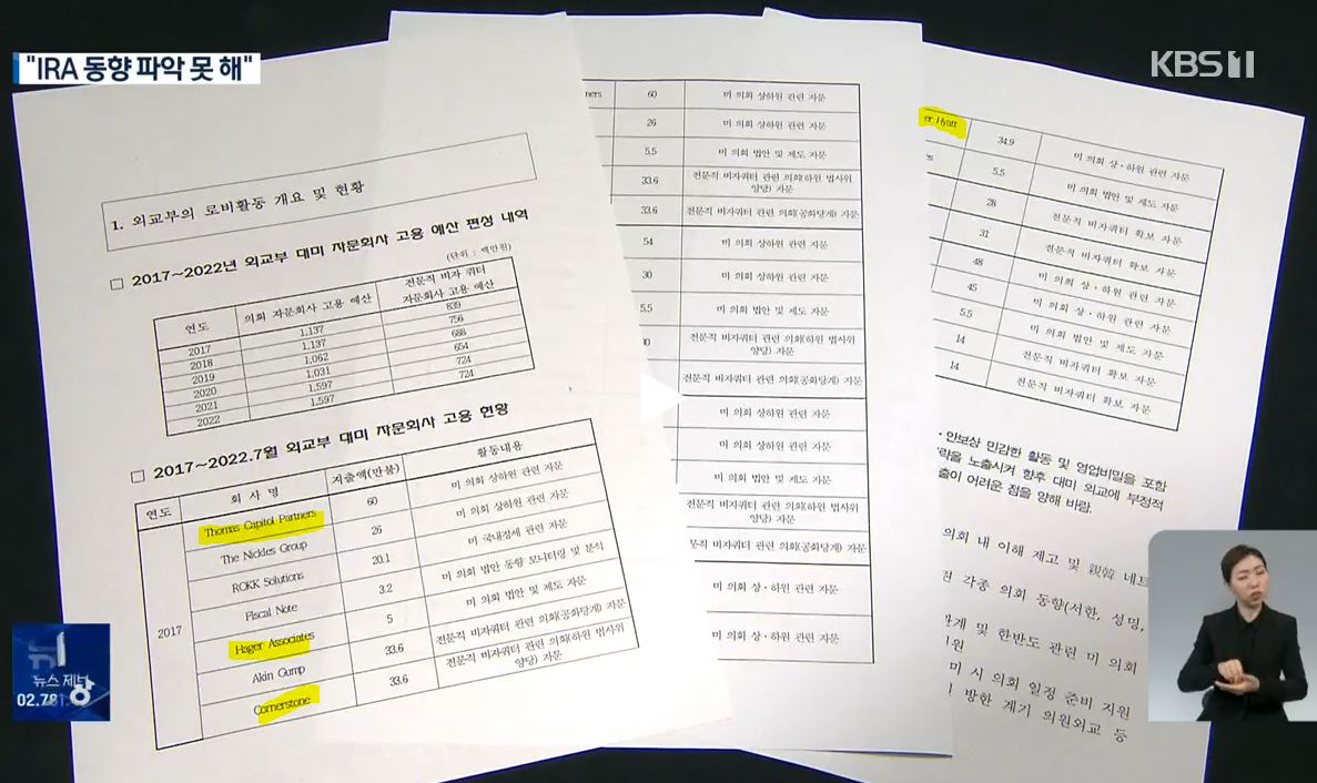 | Subject | 외교부, 미국 로비업체 5곳 고용하고도 IRA 논의 전혀 몰랐다 |