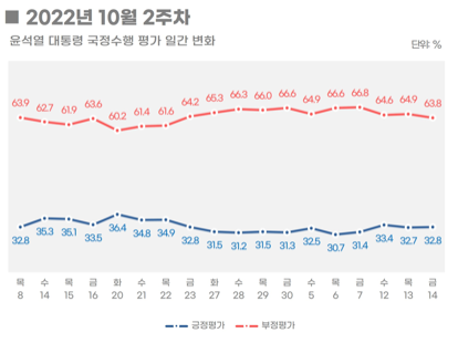 | Subject | [리얼미터 10월 2주차 주간 동향] 尹 대통령 지지율 33.1%(1.1%p↑).. 民 46.4%, 국힘 36.3% |