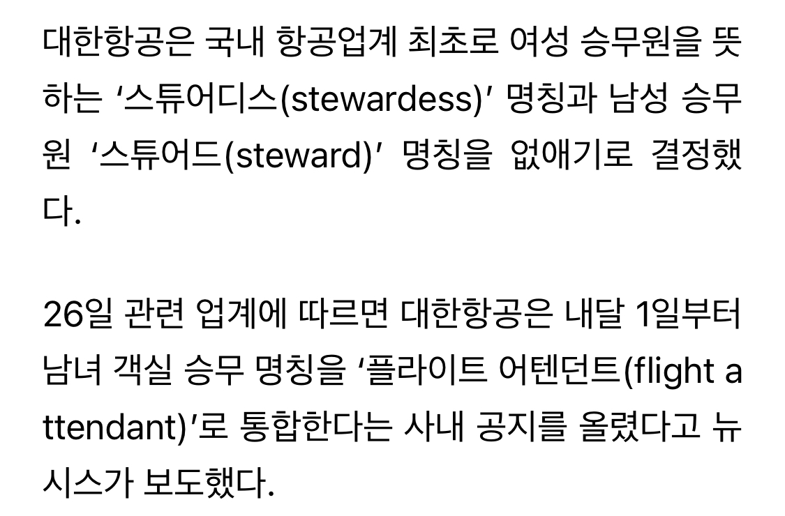 | Subject | “스튜어디스라고 부르지 마세요”…대한항공, 새롭게 정한 명칭은 |