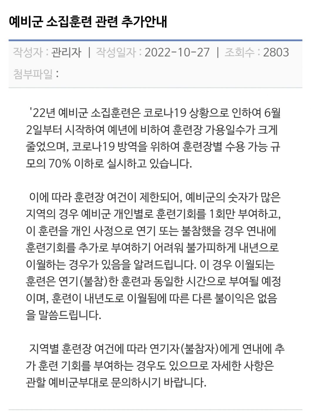 | Subject | 훈련 못간 예비군, 내년에 두번 가라? |